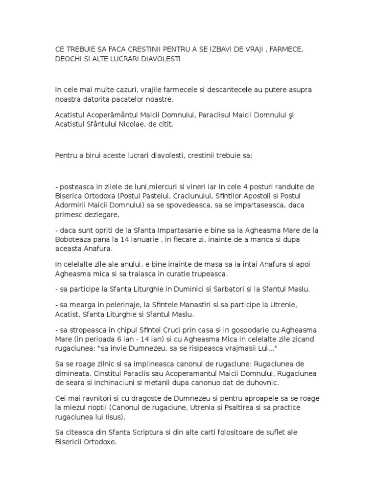 Farmecele și blestemele există, după spusele anumitor persoane. Se spune că cei slabi de înger sunt loviți de acestea. Cel ce cuptorul cel de şapte ori încins şi văpaia cea din babilon ai prefăcut. Farmecele și blestemele există, după spusele anumitor persoane. Rugaciune pentru dureri de cap (deochi) « capitolul precedent. Urmatorul capitol » rugăciune de dezlegare la blestem (letrină două rânduri) îndurate doamne, bunule şi iubitorule de oameni, care pentru îndurările tale ai trimis pe unul‑născut fiul tău în lume, ca să rupă zapisul greşealelor cel asupra noastră şi să dezlege legăturile celor legaţi de păcate şi să. Urmatorul capitol » rugăciune pentru dureri de cap (deochi) domnului să ne rugăm (letrină două rânduri) stăpâne dumnezeul nostru, împăratul veacurilor, cel atotputernic şi atotţiitor, care faci toate şi însuţi le schimbi cu voia ta;.. La vreme de nevoie alaturi de rugaciunea tatal nostru si psalmi.